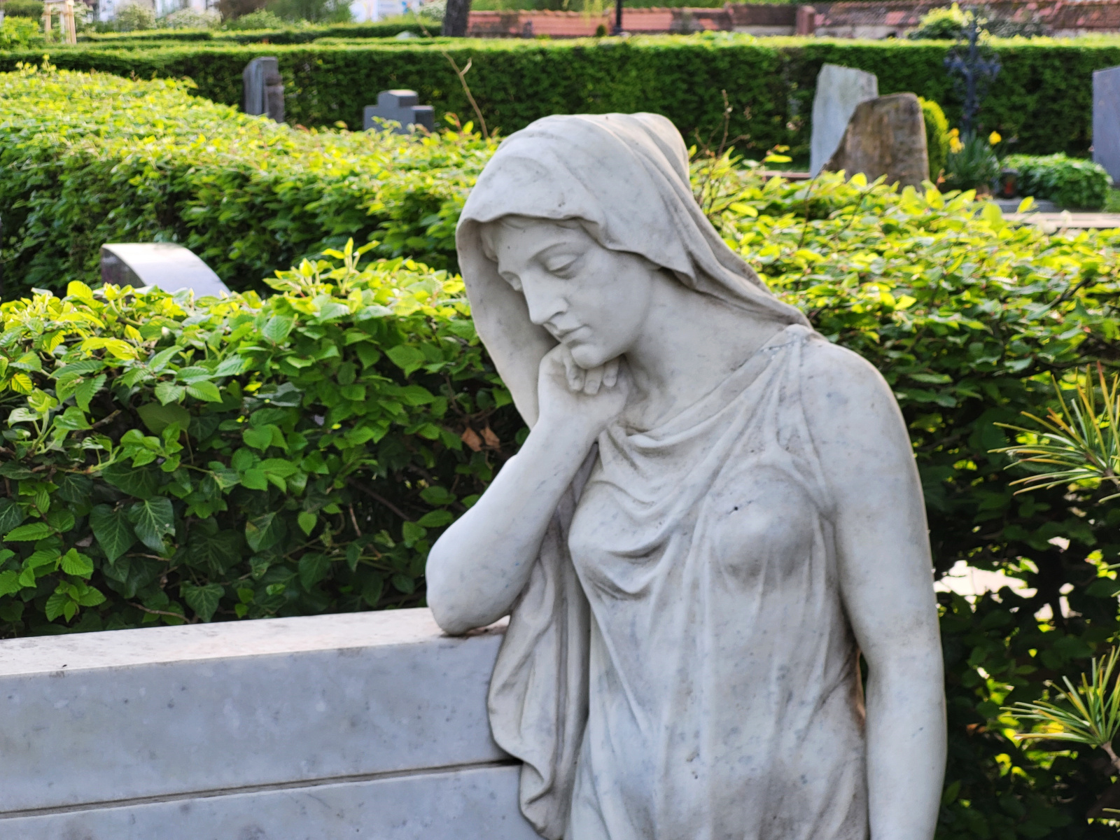 Trauernde Frau aus weißem Marmor als Grabfigur, Hauptfriedhof Wiesloch. | © Stadt Wiesloch