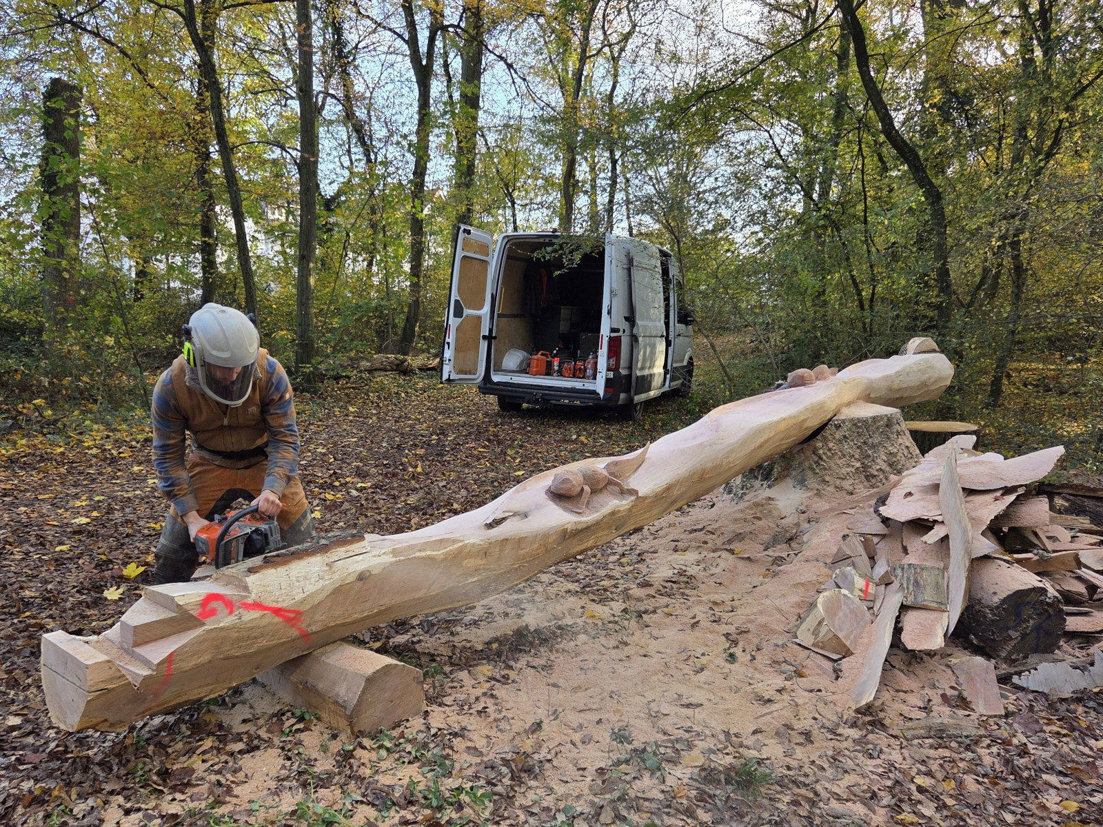 In unmittelbarer Nähe der neu angelegten Feuchtbiotope schuf der Künstler in den letzten drei Tagen aus dem Stamm der Eiche und nur mit dem Einsatz verschiedener Motorsägen den „Lebenszyklus eines Frosches entlang einer Stamm-Murmelbahn“ Diese wird insbesondere für die kleinen Waldbesuchenden eine tolle Attraktion werden. Mitbringen müssen die Kinder und Ihre Begleitung lediglich die Murmeln, um diese dann den Stamm entlangrollen zu lassen. Der besondere Dank geht an die Volksbank Kraichgau, die sich mit einer großzügigen Spende daran beteiligt hat.