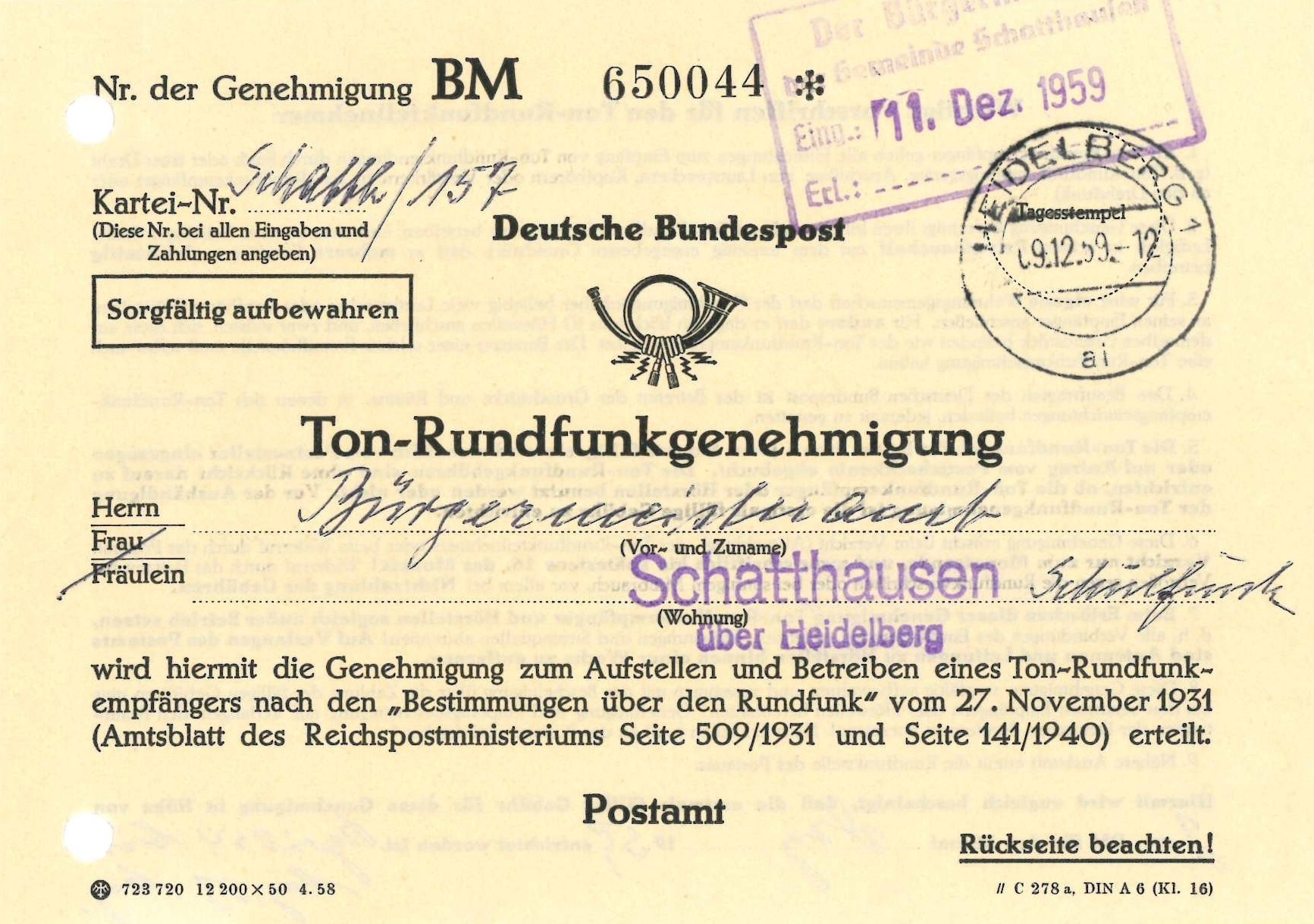 Ton-Rundfunkgenehmigung der Deutschen Bundespost von 1959 - April 2024