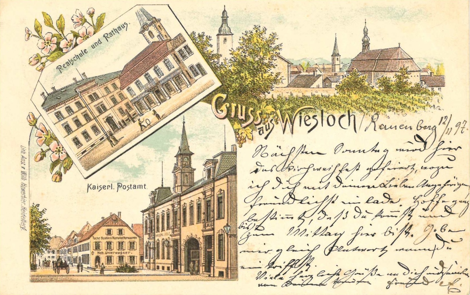 Beim Betrachten der drei Abbildungen auf der Postkarte werden dem Ortskundigen sowohl vertraute, als auch heute nicht mehr existente Elemente des Wieslocher Stadtbildes ins Auge springen. Namentlich benannt ist hier das prachtvolle Kaiserliche Postamtsgebäude, in welchem zwischenzeitlich die Bezirkssparkasse untergebracht war und das, nach Umzug der Bank, zugunsten der heutigen Straßenführung abgerissen wurde.