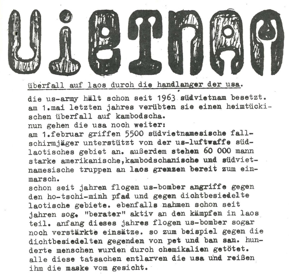 Von 1955 bis 1975 tobte in Indochina der Vietnamkrieg, der spätestens mit dem Kriegseintritt der USA 1964 von der Weltöffentlichkeit auch als Kampf der Westmächte gegen den sogenannten Ostblock um eine Erweiterung des jeweiligen Einflussgebietes gesehen wurde. Die Berichte und Fernsehbilder von grausamsten Kriegsverbrechen, die durch US-Truppenangehörige an der vietnamesischen Zivilbevölkerung verübt wurden, lösten die Gründungen großer internationaler Protest- und Friedensbewegungen aus, die in Deutschland auch die Rolle der die USA weitestgehend unkritisch unterstützenden Bundesregierung und das internationale Wettrüsten anprangerten.