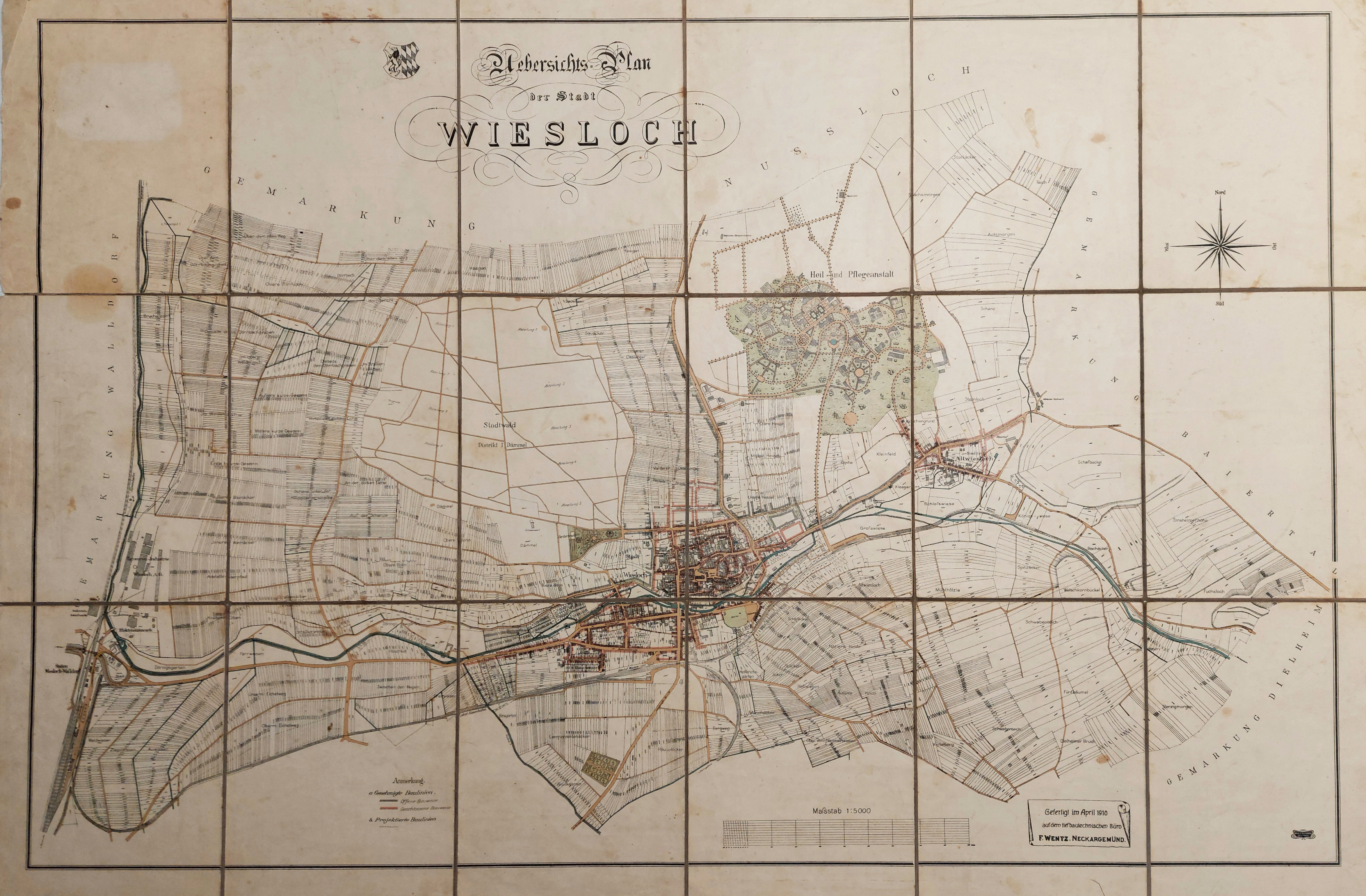 Diesen Monat präsentieren wir Ihnen einen „Neuling“ im Wieslocher Stadtarchiv, der zwar schon 114 Jahre auf dem Buckel hat, sich aber bis vor kurzem noch in Privatbesitz befand: Einen detaillierten, kolorierten und großformatigen Stadtplan Wieslochs aus dem Jahr 1910.