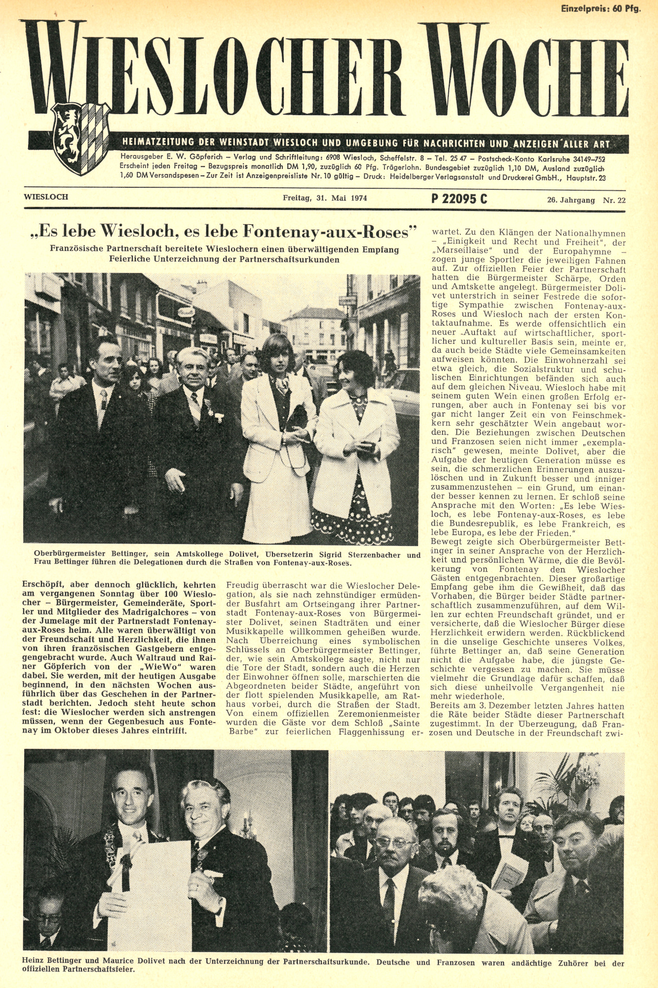 Trotzdem soll dieser Hintergrund die Bedeutung der Entstehung dieser Freundschaft in keiner Weise schmälern. Denn abseits alles politischen Kalküls wurde die wechselseitige Wiederannäherung durch ihre Protagonisten auch aus echter Überzeugung durchgeführt und es ist deren ausgeprägtem Willen zur Versöhnung zu verdanken, dass Deutschland und Frankreich heute ein freundschaftlich-partnerschaftliches Verhältnis auf Augenhöhe zueinander pflegen. Die Wiederannäherung sollte nicht nur auf staatlicher Ebene befördert werden, sondern ganz bewusst auch im Kleinen, also seitens der Kommunen. Diese Entwicklung beschränkte sich im Übrigen nicht auf Deutschland und Frankreich, sondern wurde auch zwischen anderen Ländern westlich des Eisernen Vorhangs betrieben. Gemeinden und Städte suchten den Kontakt zu Partnern vergleichbarer Größe in anderen Staaten. So geschehen auch in Wiesloch, das seine erste Städtepartnerschaft 1966 mit der US-amerikanischen Stadt Sturgis (Michigan) besiegelte. In den 1970er-Jahren war es dem damaligen Wieslocher (Ober-)Bürgermeister Heinz Bettinger schließlich ein Anliegen, auch eine Partnerschaft mit einer Stadt des unmittelbaren westlichen Nachbarn einzugehen, und so kam es 1973 zur Kontaktaufnahme mit der französischen Stadt Fontenay-aux-Roses. Bettinger fand in deren damaligem Bürgermeister Maurice Dolivet einen Gleichgesinnten, dem das Knüpfen partnerschaftlicher und freundschaftlicher Bande mit dem deutschen Nachbarn ebenfalls eine Herzensangelegenheit war. So sagte Dolivet selbst über die sich anbahnende Partnerschaft: „Gleich nachdem die ersten Kontakte mit Wiesloch aufgenommen wurden, entstand zwischen uns Freundschaft und Sympathie.“ Demgemäß war es Ende 1973 nur noch eine Formsache, dass die Gemeinderäte der beiden Städte sich für den Vollzug der Partnerschaft im darauffolgenden Jahr aussprachen.