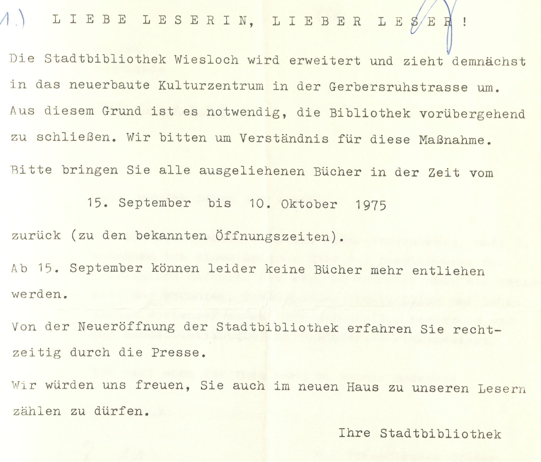 Im Spätsommer 1975 wurden die Bibliotheksnutzer per Pressemeldung und Aushang über den bevorstehenden Umzug informiert.